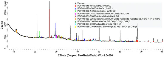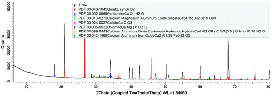 XRD studies showed the formation of crystal structures, i.e., quartz, portlandite, dolomite, calcite, and crystals involving aluminum and iron (Figure 8).