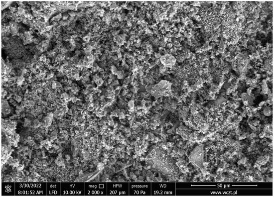 XRD analysis (Figure 11) showed significant amounts of quartz and calcite. Calcite is characterized by a wide variety of crystallographic forms. The presence of aluminum compounds was also confirmed by XRD analysis.