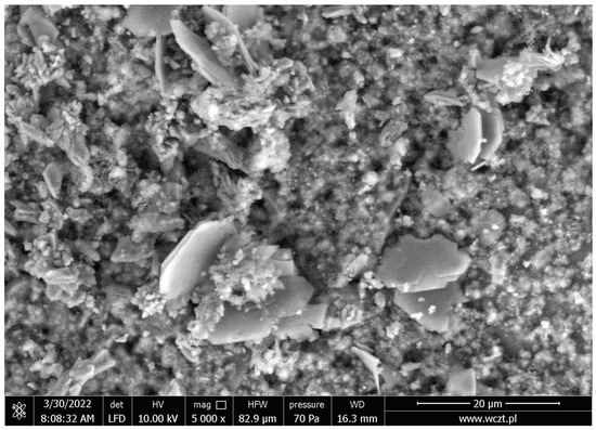 All tests were conducted using Portland cement of the CEM I 42.5N class, in accordance with the European standard PN-EN 196-1:2016-07 [34]. The cement was obtained from the Heidelberg Materials factory. Elemental microanalysis of the cement was performed using an SEM microscope and an EDS detector. The results are presented in Figure 4.