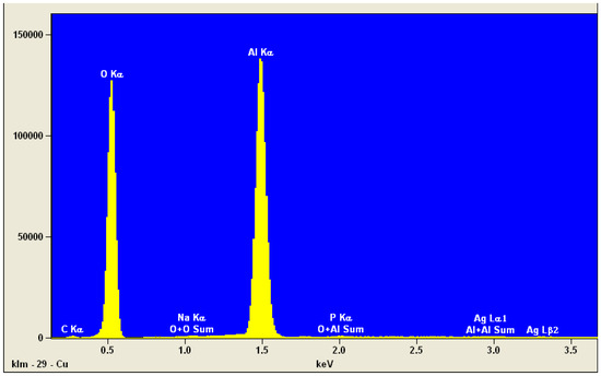 - Scanning Electron Microscopy (SEM) with Energy Dispersive Spectroscopy (EDS): The SEM/EDS analysis was conducted using a high-resolution environmental scanning electron microscope (Quanta 250 FEG, FEI, Hillsboro, OR, USA) equipped with an EDS analyzer. This technique provided localized elemental mapping and microstructural details of the samples.