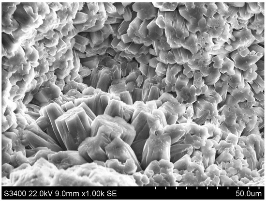 Aluminum reacts with calcium to form calcium aluminates and hydrated forms. Hydrocalumite, which is typically crystalline, is characterized by hexagonal, plate-like structures, as observed in the SEM image (Figure 12). The hydration mechanism of calcium aluminates is related to the dissolution process in which the anhydrous phase dissolves and the hydrates precipitate from the solvent. Three independent phases can be distinguished: dissolution, nucleation and precipitation. The hydration process is initiated by hydroxylation of the cement surface, followed by dissolution of the cement in water and release of calcium and aluminum ions. A small amount of hydrate gel is formed when the concentration of ions exceeds the solubility level of C2AH8 and AH3 hydrates. Solubility continues with a parallel increase in the concentration of calcium and aluminum ions in the water until a saturation level is reached. Then, crystal spores are formed in large numbers, this phase is called nucleation.