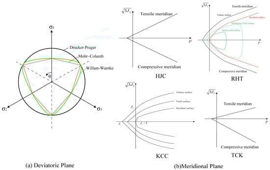 The HJC model has a yield surface that uses the Drucker–Prager model without considering the effect of the third deviatoric stress invariant J3. The shape transformation, in which the deviatoric plane in the stress space changes from a triangle under low pressure to a circle under high pressure, is neglected. Therefore, it cannot capture the asymmetric properties in the tension and compression of concrete [19].