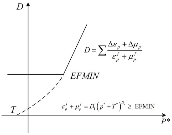 where is the equivalent plastic strain increment, is the failure plastic strain, and are the damage parameters, is the normalized current hydrostatic pressure, and is the minimum failure strain.