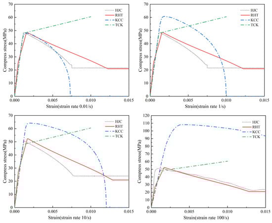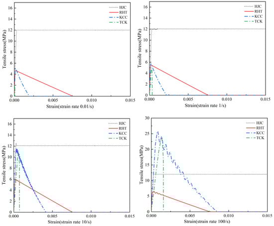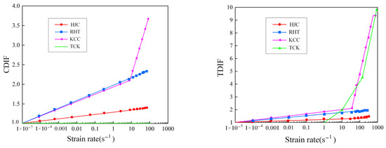 The strain rate effect is represented by the isotropic expanding method in the four models. Figure 5 shows the compression and tensile strain rates of the four models. The HJC model uses the natural logarithm form of the equivalent strain rate, the RHT model uses the exponential function form of the equivalent strain rate to describe the strain rate strengthening effect, and the strain rate enhancement factor of KCC can be determined through tests and freely input, generally using CEB code [34]. The TCK model has no compressive strain rate effect, and the tensile strain rate is derived by tensile fracture stress [35]. It should be noted that DIF relationships in models are all obtained by directly fitting test data, so the DIF includes the dynamic characteristics of materials and the strength increase caused by structural effects [36,37,38], which may lead to errors due to the test conditions and sample size.