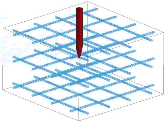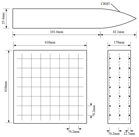 The perforation experiments of reinforced concrete (RC) performed by Hanchak et al. [2] were adopted for the present analysis, as shown in Figure 6. The length of the projectile is 101.6 mm, the diameter is 25.4 mm, and the coefficient CRH of the oval head is 3. The dimension of the reinforced concrete target plate is 610 mm × 610 mm × 178 mm, the reinforcing steel bar is staggered in three layers, the mesh size is 76.2 mm × 76.2 mm, the distance between the steel layer and the concrete surface is 12.7 mm, and the diameter of the steel bar is 5.69 mm.