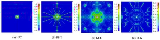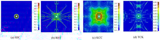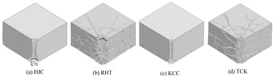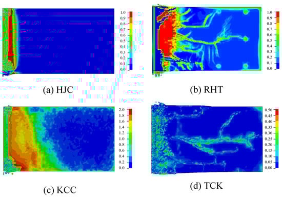 - The RHT and TCK models can effectively describe all types of failure in concrete through damage value or erosion. The HJC model inaccurately represents tensile damage and crack propagation, while the KCC model’s damage pattern for estimating cracks is blurred and can barely simulate tensile cracks through erosion.