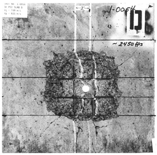 - Beppu, M.; Miwa, K.; Itoh, M.; Katayama, M.; Ohno, T. Damage evaluation of concrete plates by high-velocity impact. Int. J. Impact Eng. 2008, 35, 1419–1426. [Google Scholar] [CrossRef]