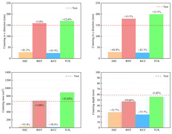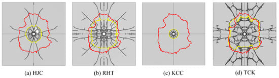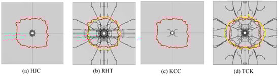 The macroscopic phenomena observed in the simulation can be explained through the analysis presented in Section 3. The tensile strength model of the HJC is elastic–perfectly plastic, which disregards the softening stage. The tensile strain is underestimated, which limits the expansion of tensile cracks. Consequently, the range of cratering and scrabbing and the growth of radial cracks are almost invisible.