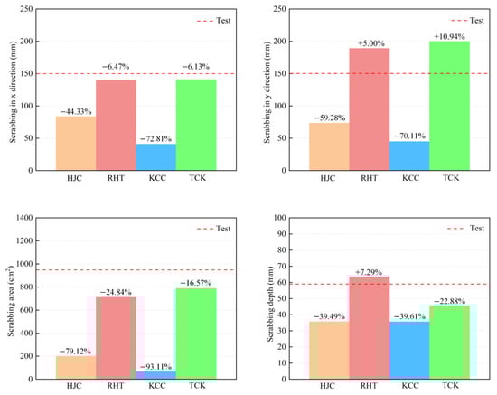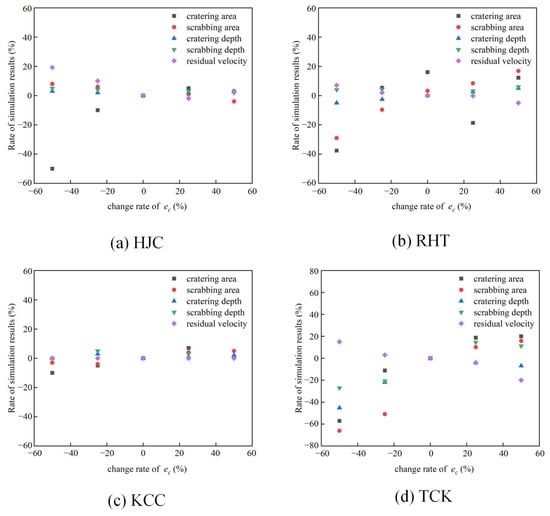 In Figure 21, the impact of the compression erosion parameter (ec) on the simulation results is depicted. Across the four models, the residual velocity of the projectile diminishes as the compressive erosion increases. When the deviation range of compressive erosion is below 25%, the residual velocity remains relatively stable. However, when the deviation exceeds 50%, significant changes in the results are evident. The cratering and scrabbing of the target exhibit sensitivity to the compression erosion parameters. For deviations less than −25%, the cratering and scrabbing range notably decreases. This is attributed to the small compression erosion parameters, which prompt the rapid deletion of elements near the projectile’s head, disrupting the stress path and normal propagation of stress waves, thereby leading to a lack of reflection in cratering and scrabbing.