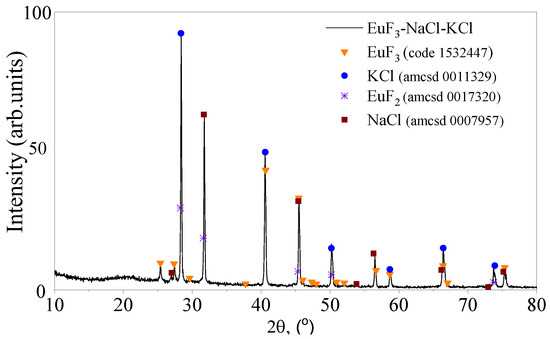 The diffractogram obtained for the solidified melt solution NaCl–KCl–EuF3 (Figure 1) is quite similar to the diffractogram of NaCl–KCl–CeF3, which indicates the insignificant content of the dispersed phase (EuF3 and CeF3) and the significant predominance of the salt matrix.