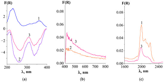 Diffuse reflectance spectra ((a) –UV, (b)–visible, and (c)–near-IR ranges) of system samples: 1–CeF3–EuF3 after calcination; 2–NaCl–KCl–CeF3–EuF3 (the upper part of the solidified salt melt); 3–NaCl–KCl–CeF3–EuF3 (insoluble sediment).