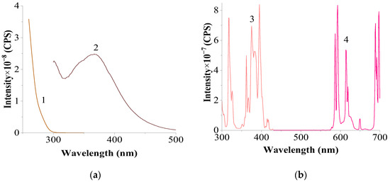 Excitation and luminescence spectra of the original CeF3 (a) and EuF3 (b) samples. (a) (slits 2.0–2.0 nm): 1—excitation spectrum of Ce3+, recorded at λem. = 367 nm; 2—luminescence spectrum of Ce3+ at λexc. = 265 nm; (b) (slits 1.5–1.5 nm): 3—excitation spectrum of Eu3+, recorded at λem. = 593 nm; 4—luminescence spectrum of Eu3+, recorded at λexc. = 395 nm.