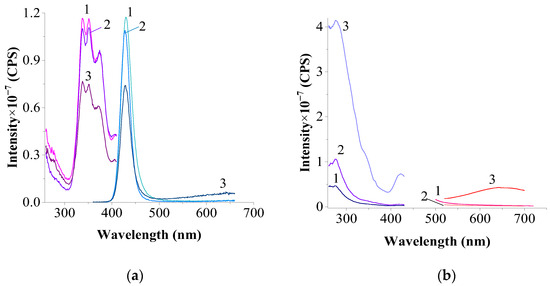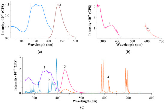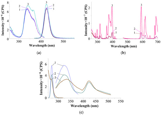 Excitation and luminescence spectra of the upper (1), middle (2), and bottom (3) parts of the sample CeF3–EuF3 (1:2) in NaCl–KCl (2:8), 750 °C for 2 h in a vacuum: (a)—excitation and luminescence spectra of Eu2+: λem. = 425 nm; λexc. = 338 nm; slits 0.6–0.6 nm; (b)—excitation and luminescence spectra of Eu3+: λem. = 591 nm; λexc. = 397 nm; slits 3.0–3.0 nm; (c)—excitation and luminescence spectra of Ce3+: λem. = 325 nm; λexc. = 273 nm; slits 3.0–3.0 nm.