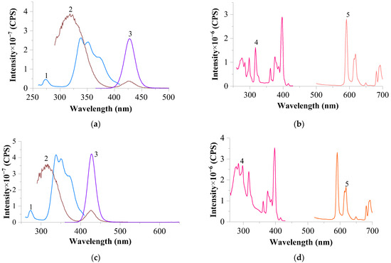 Excitation and luminescence spectra of the upper part of the melt (a,b) and the bottom part (c,d) of the melt of a mechanical mixture of CeF3–EuF3 (1:1) in NaCl–KCl (1:9): a (slits 0.6–0.6 nm): 1—excitation spectrum of Eu2+ at λem. = 428 nm; 2—luminescence spectrum of Ce3+ at λexc. = 274 nm; 3—luminescence spectrum of Eu2+ at λexc. = 338 nm; b (slits 3.0–3.0 nm): 4—excitation spectrum of Eu3+ at λem. = 591 nm; 5—luminescence spectrum of Eu3+ at λexc. = 396 nm; c (slits 0.6–0.6 nm): 1—excitation spectrum of Eu2+ at λem. = 428 nm; 2—luminescence spectrum of Ce3+ at λexc. = 273 nm; 3—luminescence spectrum of Eu2+ λexc. = 340 nm; d (slits 3.0–3.0 nm): 4—excitation spectrum of Eu3+ at λem. = 591 nm; 5—luminescence spectra of Eu3+ at λexc. = 397 nm.