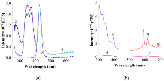 The maximum in the broad diffuse band (Eu2⁺) is fixed at 340 nm in the excitation spectra recorded at λem. = 428 nm. Additionally, a maximum at 274 nm is observed, corresponding to the excitation spectrum of Ce3⁺. The following emission bands appear in the luminescence spectra: an intense Ce3⁺ band with a hypsochromic shift in the emission maximum at λmax. = 318 nm, an intense Eu2⁺ band with λmax. = 427 nm, and low-intensity Eu3⁺ bands corresponding to the 5D₀ → 7F₁ and 5D₀ → 7F₄ electronic transitions, exhibiting characteristic splitting.