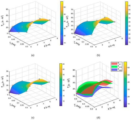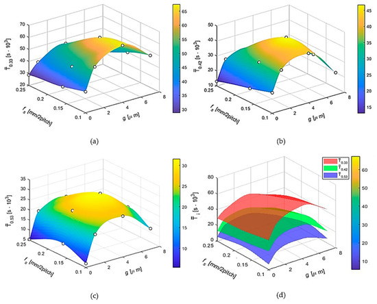 Figure 4d presents comparative plots showing the effect of the parameters studied, i.e., coating thickness g, feed fs for the adopted cutting speeds vci, on the durability of the modular chisel blades. All data were approximated using cubic spline interpolation to produce smooth surfaces that match the actual data points.