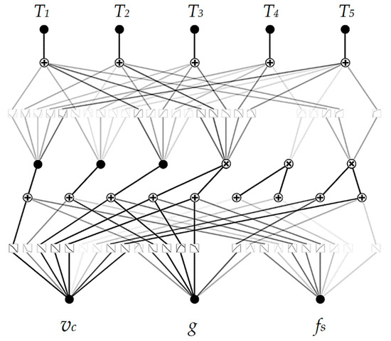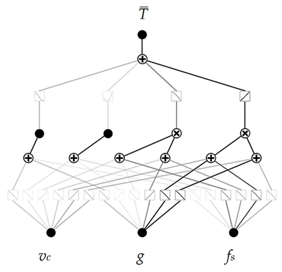 The advantage of using the KAN model is that they can be interpreted, and the complexity is reduced by using a pruning operation. The pruning operation is based on the identification of connections and neurons whose weights are close to 0 or whose influence on the final result is small. The identified element is removed from the model architecture. This operation reduces the number of nodes in the architecture, which facilitates interpretability. The architecture of the model after the pruning operation is shown in Figure 10.