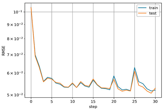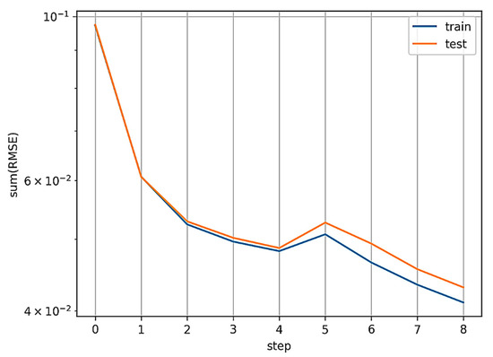 Based on Figure 12, it can be concluded that the KAN-based model determines values more effectively than the MLP-based model. Based on the course of the loss function values, it can be concluded that the optimal value (minimum) in the case of the KAN model was reached after step 8. The course of the value of the change in the loss function per time period is shown in Figure 13.