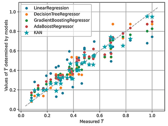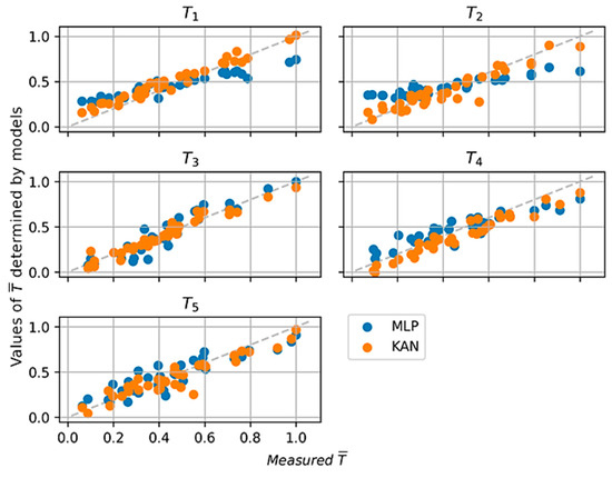 It was decided to use the KAN model and compare it only with the Multi-Layer Perceptron (MLP) model because the other previously used models performed worse than the KAN model on every metric. Due to the multiple outputs, the RMSE- was taken as the loss function in both cases. The MLP model consists of 3 hidden layers, in the first of which the numbers of neurons are 100, 50, and 10, respectively. The ADAM (ADAptive Moment Estimation) algorithm [33] was used to optimize the model, as it allows adaptive adjustment of learning rates for each parameter. The architecture of the KAN model was changed due to the presence of multiple outputs. The number of summing nodes was assumed to be 3, and the number of multiplying nodes was also 3. The KAN model achieved a sum(RMSE) lower than the MLP model. In almost every case, the KAN model’s metrics are better than the MLP. The parameters of the KAN model were better fitted to describe the relationship between the variables due to the use of the Kolmogorov–Arnold approximation theory. Only for the output value did the MLP model achieve better values. A summary of the metrics values is shown in Table 6, and graphs comparing measured and values determined by models are shown in Figure 12.