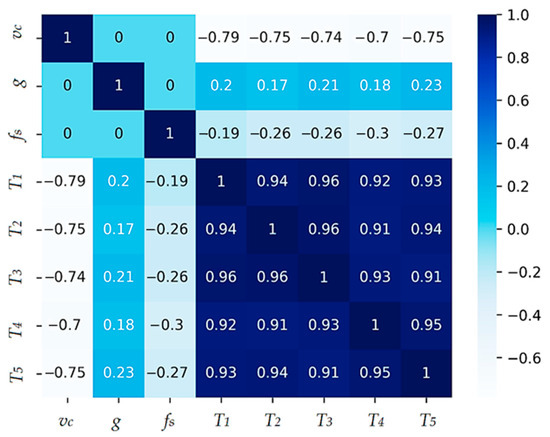 In the case of the second model, in which the same output values are assumed, while the output values are where Ti (i = 1, 2, 3, 4, 5) equals the durability of individual tools from which the average durability value was determined, the correlation between the data was first re-examined by applying the correlation matrix. It was noticed that there is a very strong positive correlation between the output parameters. In addition, each of them correlates negatively with the parameter , and there is a weak correlation for the parameters and -positive and negative, respectively. A correlation matrix shows the correlation coefficients between different variables in the data set. Each element of the correlation matrix measures the degree to which two variables are related to each other. The correlation matrix is shown in Figure 11.