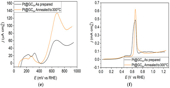 Pt@S catalysts have been studied using the potentiodynamic method. Figure 1c, Figure 2c and Figure 3c show the steady-state voltammograms of the three Pt-based thin-film catalysts in perchloric acid solution, obtained before and after annealing in H2/Ar at 300 °C. The presented voltammetric curves show that the processes during the potential sweep can be divided into hydrogen adsorption/desorption in the potential region up to E~0.35 V, parallel with the reversible OH− adsorption up to E~0.75 V; later, at more positive potentials, the irreversible oxide formation occurs. All three electrodes show comparable behavior in the reactions associated with H+ and OH− adsorption/desorption. At higher potentials, the Pt@GCox electrode shows a slower onset of oxide formation and a shift in the peak corresponding to oxide reduction towards more positive potentials. It indicates weaker adsorption of oxide species compared to the other two electrodes. The voltammetric profile of the as-prepared Pt@S electrodes (Figure 1d, Figure 2d and Figure 3d—black lines) in the hydrogen area (0.05 V < E < 0.4 V) looks similar to the voltammetric profile for the polycrystalline Pt electrode [31,35,36] and corresponds directly to the domains with a particular surface orientation such as nature and surface sites density. Therefore, the voltammograms display adsorption states connected with (110) and (100) sites at 0.075 V and 0.195 V, respectively. The most intense peak is at 0.075 V, with a shoulder appearing at 0.195 V. Additionally, a minor shoulder at 0.295 V is hardly detectable, which is typical for a small amount of brief (100) terraces [37,38,39].