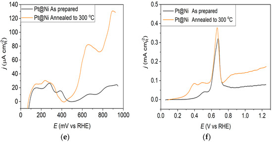 For the Pt@Ni electrode annealed at 300 °C (Figure 2c—orange curve), the voltammogram is very similar to the as-prepared one (Figure 2c—black curve) in the hydrogen adsorption zone. Still, it demonstrates an increase in current in the oxide region. The increase in peak current at 0.075 V might indicate that thermal annealing causes changes in the specific surface structures because of the rearrangement of atoms on the surface in favor of the (110) plane. The peak at 0.8 V, which results from the adsorption of OH− anions at the surface, shows the same growth trend upon annealing, indicating an increase in surface oxophilicity.