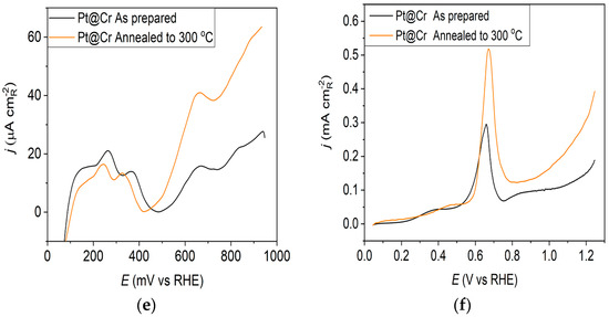 The Pt@Cr electrode annealed in H2/Ar to 300 °C (Figure 3d—orange curve) displays an increase in current at 0.195 V compared to the voltammogram for the as-prepared catalyst (Figure 3d—black curve). This feature is characteristic of hydrogen adsorption at (100) step sites on (111) terraces with a contribution from (100) steps near (100) terraces for the same potential [19].