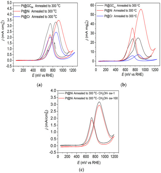 Figure 5a displays the methanol oxidation reaction for the three catalysts obtained upon annealing to 300 °C in 0.1 M HClO4. These findings indicate some notable differences in the obtained voltammograms when using Pt catalysts on a different substrate. The reaction initiates at comparatively low potential values (~0.5 V) compared to the onset of the reaction for the as-prepared Pt@S electrodes, which is around 0.6 V, indicating improved catalysts activity (Figure 4). Upon annealing the Pt@GCox electrode in a reductive atmosphere, it was observed that both peaks in the forward and backward scan exhibited nearly identical characteristics. On the Pt@Cr electrode, the forward scan oxidation peak has a slightly higher current density compared to the oxidation peak in the backward scan. However, on the Pt@Ni catalyst, the peak in the positive scanning direction has a significantly higher current density value than in the negative scan direction. It was concluded that the oxidation peak observed during the reverse scan was not associated with the oxidation of the remaining intermediate, but it most likely originates from the oxidation of methanol on the Pt surface covered with oxygenated species [54]. The ratio between the forward oxidation peak current (If) and backward oxidation peak current (Ib), If/Ib, is not associated with the degree of CO tolerance. Instead, it is associated with oxophilicity.