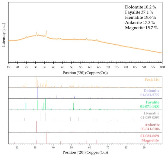 The X-ray diffraction (XRD) pattern of Koranel, which is used as the base material in this research, is shown in Figure 2. The XRD analysis is performed on a PANalytical AERIS X-ray diffractometer (Malvern Panalytical, Almelo, The Netherlands) using Cu-Kα radiation with a scanning range from 10° to 100° 2θ and step size of 0.003° (2θ). Qualitative analysis of X-ray diffraction, performed using the ICDD PDF4+ database, allows the identification of the following phases: fayalite (card no.: 01-071-1400), dolomite (card no.: 01-083-5727), ankerite (card no.: 00-041-0586), magnetite (card no.: 01-084-6691), and hematite (card no.: 01-089-0597). Quantitative analysis carried out using the Rietveld method allows for determining the content of detected phases, the shares of which are 37.1%, 10.2%, 17.3%, 15.7%, and 19.6% for fayalite, dolomite, ankerite, magnetite, and hematite, respectively. However, these values should be taken as approximate due to the presence of an amorphous phase (as indicated by a broad hump in the range of 22 ° to 38° 2θ) and high background noise intensity.