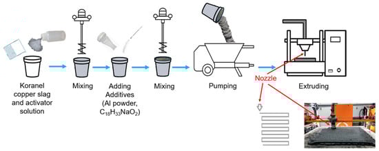The geopolymer paste is prepared by mechanically mixing the dry ingredients with an alkaline solution. In the case of 3D printing, the prepared geopolymer paste is transferred to the pump, which then pushes the material to the printer. In the case of the formed samples made for comparative purposes, the finished geopolymer paste is transferred to the appropriate molds. Figure 3 presents the process of preparing the 3D printing samples in a schematic way.