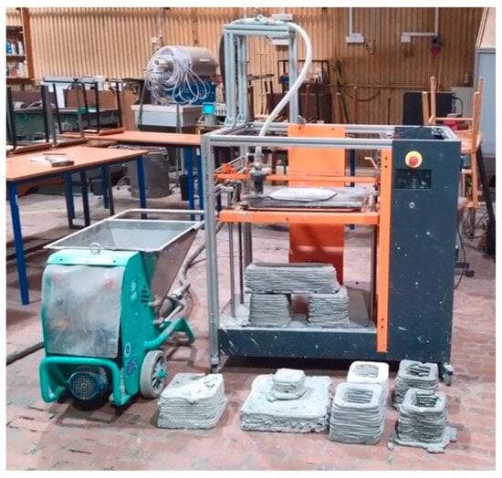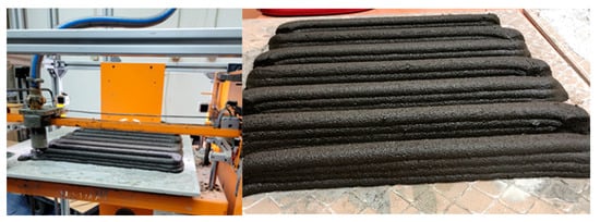 Figure 4 shows the tooling used during 3D printing. From the left, the Imer Small 50 device (Imer Group, Kraków, Poland) transports the material to the nozzles, which is equipped with a progressive cavitation pump, also known as the Moineau pump (the operating principle was patented in 1930). The device has a stainless-steel tank with a volume of 50 L. The inverter enables smooth adjustment of the material flow speed during printing, with the material feeding rate for printing the tested samples being approximately 2 dm3/min. The pump is connected directly through a hose transporting the material to the nozzle of the Galaxy printer—manufactured by ATMAT (Kraków, Poland). This device allows printing in FDM/FFF technology and has been appropriately adapted to print from concrete/geopolymer materials. The size of the printer’s worktable is 460 mm × 460 mm. When printing from the tested material, a nozzle with a diameter of Ø20 mm is used. Since the printer is not connected to the pump via an electrical system, the optimal printing method is Spiralize Outer Contour printing. Thanks to this, the material is transported continuously, and there is no problem with a lack of retraction. Printing from the tested material is performed by applying a 10 mm high layer of material (number of layers: 4) at a speed of 300 mm/s to a rough ceramic plate placed on the printing table. The printer nozzle moves in the XY plane, and the feed in the Z axis is achieved by changing the table height. After completing the printing process, the ceramic plate with the print is removed from the working field, while the print is left to harden under the foil at ambient temperature. A photo of the printout in the form of single lines is shown in Figure 5.