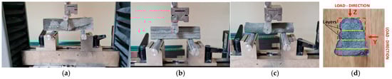 The strength of the interlayer bond is a critical factor in the effectiveness of 3D printing technology. Assessing the bond strength requires selecting an appropriate method for measuring the bond between layers and understanding its behavior. Currently, the existing study of 3D-printed elements relies on methods used to measure the bond strength in materials such as concrete or wood []. Techniques used to evaluate the interlayer bond strength mostly include direct tensile, splitting, compression, flexure, and shear strength tests. In the literature, we can find different evaluations of this approach. In the opinion of Zhang et al. [], the assessment of bond quality based on a compression test is sufficiently reliable. On the other hand, Nerella et al. [] believe that such analyses should be approached with care. In the opinion of the authors, the analysis of interlayer connections based on static load tests is, for the purpose of assessing the mechanical strength of printed elements, more adequate. In a previous publication, the authors have provided a detailed description of the test method for 3D-printed elements [].