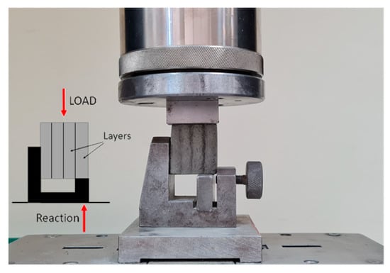 Obtaining shear stresses at the interface between the layers of the element requires a suitable support for the specimen. An external holder, shown in Figure 9, is used for this purpose. The chosen test approach facilitates the identification of maximum shear stresses and the assessment of the quality of layer adhesion within the printed material. The load increment for shear is 50 N/s.