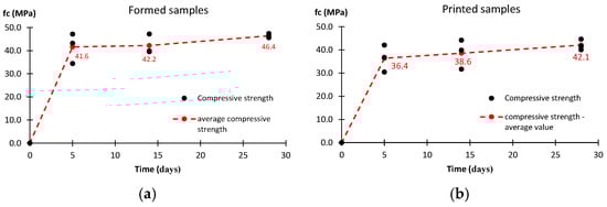 The test results of the compressive strength for the formed and printed specimens are shown in Figure 10. The strength development of the material is analyzed based on tests carried out after 5, 14, and 28 days. Three samples are tested each time. The black points on the graph represent a single measurement, and the red points show the average value. The observed kinetics of the strength increase indicate that the most intense strength development occurs during the first five days. The strength increase between 5 and 28 days is about 15%. The average compressive strength after 28 days for the formed samples is 46.4 MPa, and for the printed samples, it is 42.1 MPa. The results for the formed material are just 10% higher compared to the printed material.