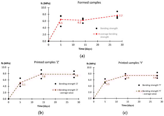 The results of the bending strength for different ways of producing samples are shown in Figure 11. For printed samples, the analysis is carried out in two directions. The course of the observed strength development is very similar. After 5 days, the material formed in molds has already achieved approximately 85% of the 28-day strength. Additionally, for the printed materials, the greatest increase in strength is observed in the first five days, but the strength is slightly lower. However, in the later period, the increment is greater. After 28 days, the average bending strength value regardless of the bending direction and forming method is in the range of 7.4 MPa to 7.8 MPa.