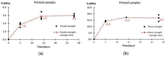 The average tensile strengths for printed sample ft after 5, 14, and 28 days are 1.8, 2.9, and 3.0 MPa, respectively. All values obtained are shown in Figure 12a. During the tests, the failure of the specimens is observed at the connection zone of the layers where the minimum cross-section is measured. For shear strength fs (Figure 12b), the average strength value after 5 days is 14 MPa. Further measurements after 14 and 28 days indicate not very large changes. The increase in the average value is less than 20%. Similarly, in this case, the failure occurred at the interface between the layers of printed material.