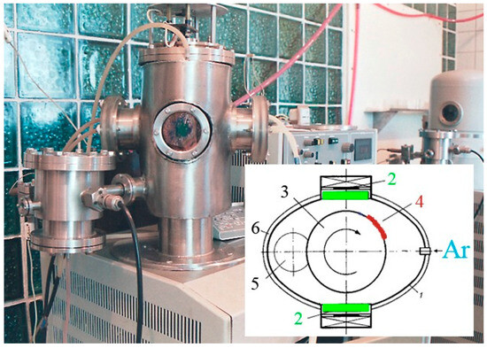 Figure 1. Setup for forming coatings of the tungsten-lead system: 1—vacuum chamber body; 2—magnetrons; 3—cylinder; 4—substrate; 5—gas evacuation window; 6—device body.