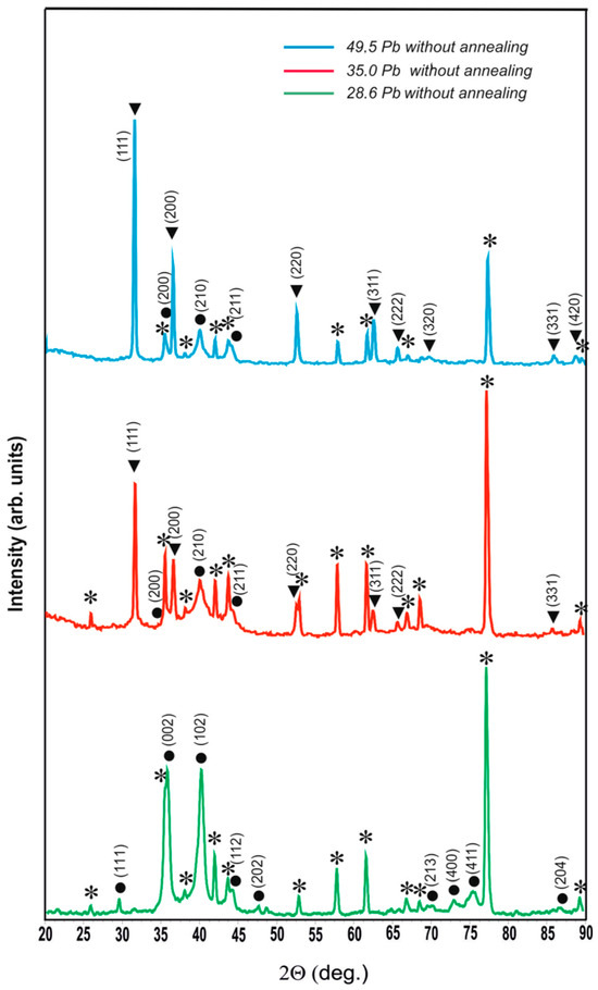 Figure 2. Diffractograms of non-annealed coatings of W-Pb system with different lead content: ⁎—polycor (α-Al2O3), ●—solid solution of lead in β-W, ▼—lead.