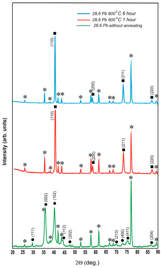 Figure 3. Diffractograms of the coating with 28.6 at.% lead content without annealing and after annealing at 800 °C for 1 h and 6 h: ⁎—polycor (α-Al2O3); ●—a solid solution of Pb in β-W (a = 0.5220 nm, c = 0.5012 nm); ■—α-W (a = 0.3163 ± 0.0002 nm).