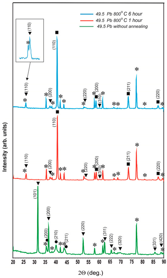 The diffractograms of this coating after 800 °C annealing for 1 h and 6 h completely coincide with the diffractograms of the coating with a Pb content of 35.0 at.%. Therefore, it can be concluded that the existence of the OCC phase with a = 0.4878 ± 0.0005 nm after 800 °C annealing is a general pattern for coatings in which lead existed as a separate phase before annealing. In Figure 5, we particularly used an enlarged scale so that no one doubts the reality of the existence of the peak (110) of this phase.