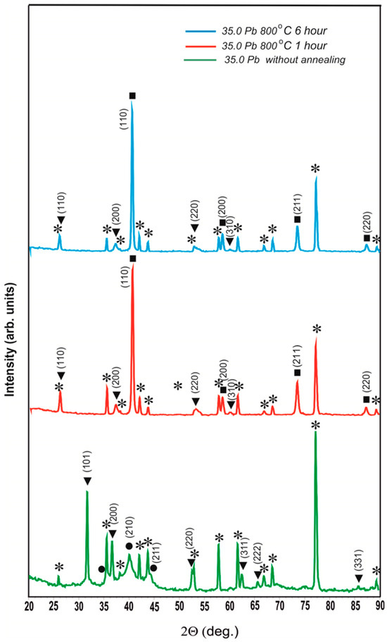 Figure 4. Diffractograms of the coating with a lead content of 49.5 at.% without annealing and after annealing at 800 °C for 1 h and 6 h: ⁎—polycor (α-Al2O3); ●—solid solution of Pb in β-W (a = 0.5077 ± 0.0011 nm); ■—α-W (a = 0.3163 ± 0.0002 nm); ▼—OCC phase (a = 0.4878 ± 0.0005 nm).