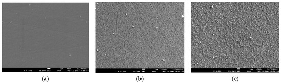 The analysis of Figure 6 shows that, before annealing, the surface of the coating is flat without any features, and even stripes can be seen on the left side of the surface of the polycor after polishing. After annealing at 800 °C for 1 h (Figure 6b), many small pores and cracks on the coating surface can be seen. After annealing at 800 °C for 6 h (Figure 6c), it can be seen that surface roughness due to a reduction in the coating volume increased, and the number of pores and the size of the cracks covering the surface also increased.