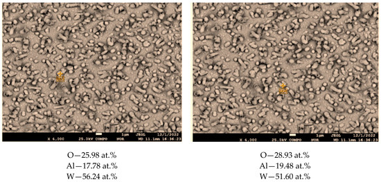 From the analysis of Figure 7, it can be seen that the coating surface after sputtering and before annealing is dense and smooth, and numerous lead whiskers long enough stick out of it. After annealing at 800 °C 1 h (Figure 7b), it can be seen that there are many small pores and cracks in the coating surface, holes are formed in the whisker walls, and the whiskers are empty inside. After annealing at 800 °C for 6 h (Figure 6c), it can be seen that the porosity of the coating between the whiskers increases, while the whisker shells remain unchanged. To understand the nature of the whiskers remaining after annealing at 800 °C for 6 h, let us consider the data from the spot EDS analysis at different points on the surface. Figure 8 shows the images of the 35.0 at.% coating surface with the elemental composition at these points.