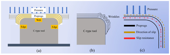 During hot diaphragm preforming, due to the factors of pressure and gravity, the prepreg layer begins to bend and fit the tooling in its flat state, and finally forms (Figure 1a). C-type tooling was taken as an example. When the prepregs were bent, the shape of the tooling limited the bonding sequence of the prepregs, and the prepregs at the web position always contacted the mold first. Under the action of pressure, the bonding of the prepregs gradually extends from the web to the side edge. At the R corner, due to the thickness of the prepregs, the bending path of the outer prepreg is always longer than that of the inner prepreg. This path difference leads to the relative slip between the layers of the prepreg (Figure 1c). At the interlayer interface of the prepreg, contact resistance is generated due to the stagnation of the resin and the contact friction of the fiber. This resistance will hinder the slip of the prepreg, resulting in wrinkles (Figure 1b). This contact resistance is called inter-ply slipping resistance, and the change in resin and fiber during the slip process is called the inter-ply slipping behavior of prepregs. The inter-ply slipping resistance is distributed on the entire prepreg contact interface. The wrinkles have the possibility of appearing at any position of the tooling.