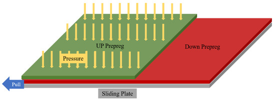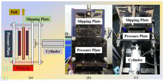 The Figure 2 shows the structure of the inter-ply slipping test device. The size of the prepregs on the pressure plates is 190 mm × 100 mm, and the size of the prepreg on the slipping plate is 460 mm × 100 mm. The angle of the fiber in the prepreg pasted on the slipping plate and the pressure plate (Figure 2b) is 0°. The length direction of the test spline is the 0° direction of the prepreg. The complete testing process is being explained. Firstly, the prepregs with a size of 190 mm × 100 mm was attached to the pressure plates, and the size of 460 mm × 100 mm was attached to the slip plate. The edge of the prepreg is fixed using a press strip. The prepregs were difficult to dissociate during the test process. The contact area between prepregs is 100 mm × 100 mm, and the slip area is also 100 mm × 100 mm. Next, the whole test system is installed on the tensile machine (WANCE, ETM204C, Hubei Wance Testing Machine Co., Ltd., Wuhan, China). The heating will be opened, if the inter-ply slipping behaviors of the prepreg at a certain temperature needs to be measured. After the prepreg temperature rises to the test temperature, it is kept for 15 min to ensure that the prepreg temperature is uniform. Finally, the tensile machine was started and the test begun. The sliding plate was pulled by the tensile machine and begun to slid. The slip velocity is 1 mm/min. When the slip distance reaches 10 mm, the test ended and the curve was recorded. Repeat five tests and record the data. The cylinder pressure has been 0.1 MPa during the test. The similar products of the system have also been applied by Zhao [22] and Wang [23].