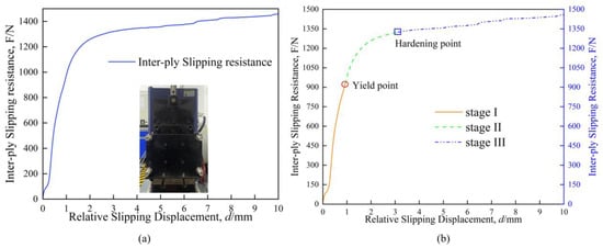 (a) the curve of inter-ply slipping resistance test; (b) Three-stage analysis of inter-ply slipping resistance curve.