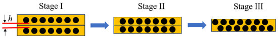 In the stage II, the speed of the puller tended to be stable. The effect of the gradual decrease of the height of the resin layer began to be obvious. The η and v remain unchanged. The inter-ply slipping resistance begins to grow nonlinearly. It is assumed that the decrease rate of resin layer height is proportional to the increase of relative slipping displacement. Then Equation (5) was obtained.
