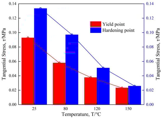 Figure 4a shows the different inter-ply slipping behaviors of prepregs at different temperatures. The inter-ply slipping behaviors of prepreg at different temperatures shows a classic three-stage distribution. In the stage I, the slipping stress is mainly caused by the fluidity of the resin and the gradual stabilization of the tensile rate. The stabilization process of the tensile rate of the testing machine is basically unchanged. Therefore, the slope of the slipping stress curve at the stage I of the prepreg at 4 temperatures is roughly the same. The slope of the 150 °C curve at the stage I is small, which was considered to be caused by the low viscosity leading to the premature entry of the slipping behaviors into the stage II. The difference in the maximum slip stress at the stage I at each temperature was due to the difference in the viscosity of the resin (Figure 4b). The stage II of slipping behavior is due to the gradual infiltration of the resin into the gap between the fibers, the flow effect of the resin is gradually reduced, and the fiber surface is gradually connected to the slipping interface, resulting in the slipping behaviors from the flow of the resin to the contact friction of the fiber surface. Due to the decrease of resin viscosity, the fluidity of the resin is enhanced, and it is easier to penetrate into the gap between the fibers, and the fibers enter the slipping interface faster. The range of the stage II also decreased with the decreased of resin viscosity. The inter-ply slipping behaviors enters the stage III faster. The stage III of the slipping behaviors is mainly caused by the mutual contact friction on the surface of the fiber. At this time, most of the resin has infiltrated between the fibers. However, the resin is not considered to be completely squeezed out of the slipping interface, and the role of the residual resin at the slipping interface is similar to ‘ lubricant ‘ and will exist for a long time, which is different from previous work [23]. The lower the viscosity of the resin, the better the fluidity and the better the lubrication effect. In the stage III, although the friction behaviors of the fiber surface leads to the slipping stress, the difference of the slipping stress value was caused by the different lubrication effect of the resin.