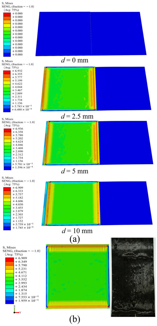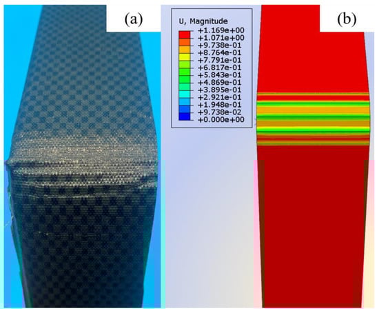 Figure 9a shows the process of finite element simulation of inter-ply slipping. The stress concentration was observed at the front and end of the slip. The prepregs was continuously bonded and detached in this area. The comparison of the finite element simulation result with the slip dynamic model and the test was shown in Figure 10. The unity of the three proves the validity and correctness of the slip dynamic model. The correctness of the finite element simulation was also proved. The slip behaviors between the prepreg layers is also proved to include Coulomb friction and fluid dynamics. The surface of prepreg after slip test was observed. The surface of the prepreg become rough after the test (Figure 9b). The area of boned and detached were also observed. The correctness of the finite element simulation results was further proved.