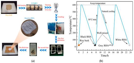 Improving the comprehensive utilization rate of solid waste resources is of great significance for environmental improvement and promoting comprehensive green development in society. As a category of solid waste, crop straw is widely sourced and generated in large quantities. Rice husk is one of the main high-yield crop straws, with enormous raw material capacity at a global level. Due to its high silica content, rice husk is difficult to degrade naturally, and the traditional utilization rate is low. If it is used as garbage for landfill, it will increase additional land occupation and soil pollution, which will cause potential harm to the environment. However, energy such as heat and electricity can be generated by burning rice husks. The residual ash, namely RHA, can be used as SCM in cement-based materials, which will greatly increase their added value [1]. The RHA obtained under certain calcination conditions contains a large amount of amorphous SiO2 porous powder [2,3]. Its particles can provide nucleation sites for cement hydration, promote the reaction of cement, and improve the hydration degree of cement [4]. The C-S-H gel formed by the pozzolanic reaction further fills the pores and improves the compactness of the pastes. The redistribution of water by the porous structure of RHA can promote the continuous hydration reaction of cementitious materials, as well as the development of mechanical and long-term properties [5,6,7]. Therefore, RHA has excellent physicochemical properties, and its feasibility as an SCM has been fully confirmed [8,9]. Currently, RHA has been researched and applied in many countries such as Asia, Africa, South America, and Western Europe, etc. [10,11,12].